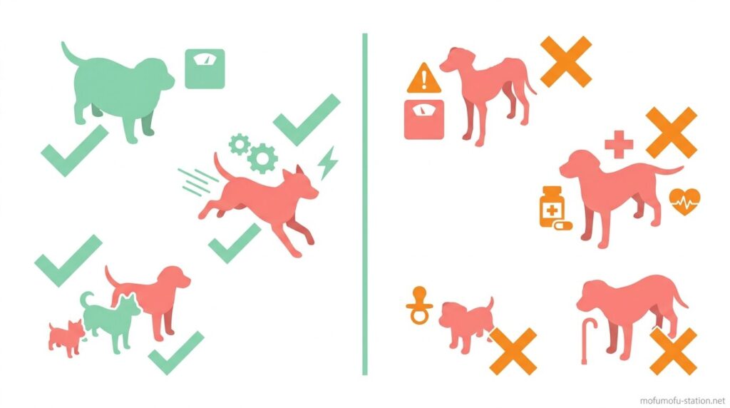 ダイエット向きの設計は、条件が合わない犬に使うと逆に体調や体型を崩す原因になります。特に体重や運動量によってはエネルギー不足になりやすいため、該当するかどうかを事前に確認することが重要です。
