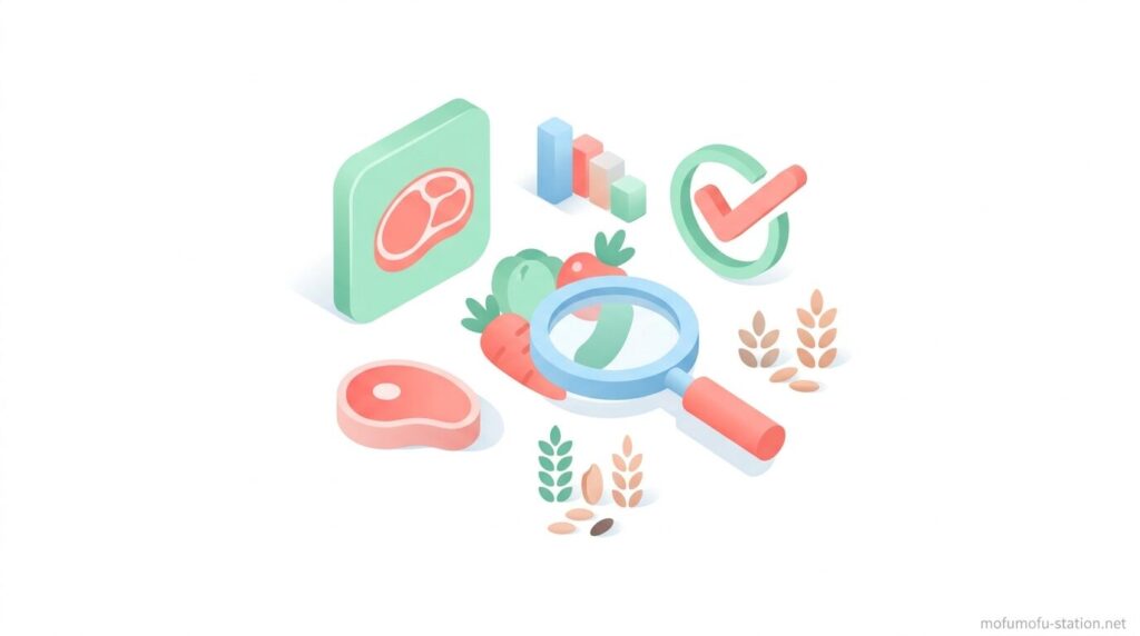 判断するときは、原材料の上位に具体的な肉名があるか、合成添加物が使われていないか、タンパク質23〜28%・脂質12〜18%の範囲に収まっているかを確認すれば、安全性と栄養バランスを把握できます。