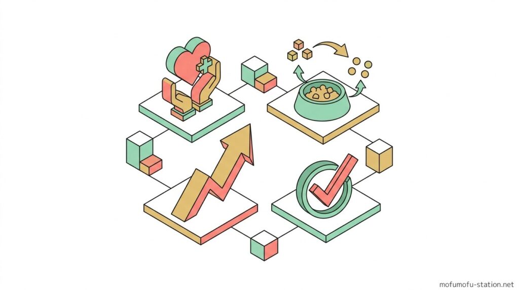 また、トッピングを毎回追加していると、トッピングだけ食べてフードを残す状態が定着します。これが続くと、通常のフードを食べなくなり、食事の基準がより強い味や匂いに偏ってしまいます。