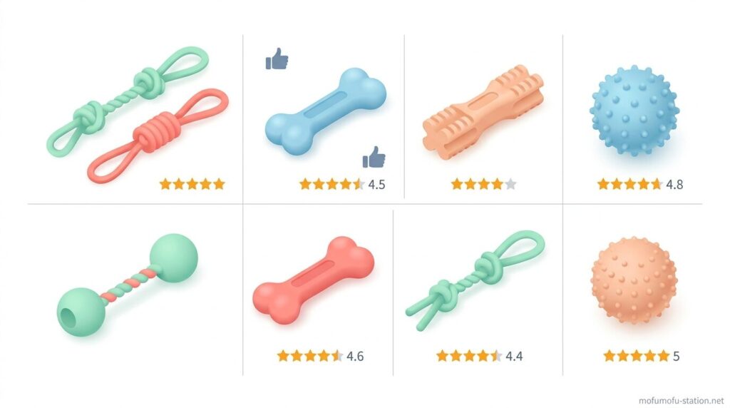 実際に、耐久性が高いものは強く噛んでも壊れにくく長時間遊べる一方で、凹凸付きのタイプは噛むたびに歯垢を落としやすく、やわらかいタイプは小型犬やシニア犬でも無理なく噛める特徴があります。