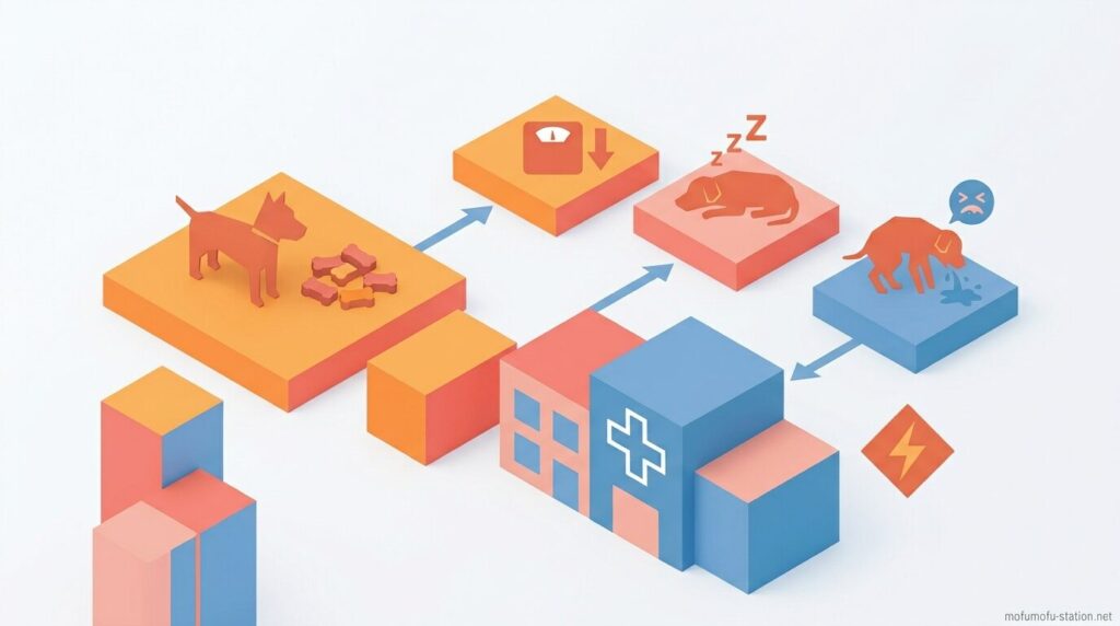 一方で、元気がなく活動量が半分以下になる状態が続く場合や、体重が1週間で5%以上減る場合、さらに24時間以上まったく食べない状態(子犬・シニアは12時間以上)がある場合は、体調不良の可能性があるため早めに受診が必要です。