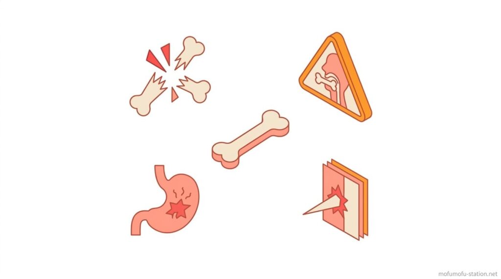 加熱された骨は噛んだ瞬間に長さ1〜3cmほどの鋭い破片になり、その尖った先端が胃や腸の内側に当たり続けることで、通過するだけで内臓を傷つける危険があります。