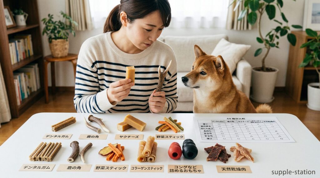 牛皮ガムが心配な場合は、「噛む欲求を満たせるか」「飲み込みにくいか」「体内でのリスクが低いか」という基準で代わりのおやつを選びます。素材や崩れ方が違えば、事故の起こりやすさも変わります。ここでは、具体的にどんな選択肢があるのかを順番に整理します。