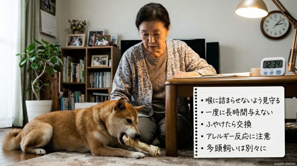 「体重 → 年齢 → 噛み方 → 時間 → 長さ3cm」の順で確認すれば、迷わず判断できます。基準を数値で決めておくことが、安全に与えるためのポイントです。