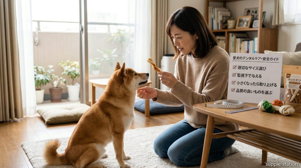 犬に牛皮ガムを与えるときは、商品選びだけでなく「与えている最中の管理」まで含めて考えることが大切です。サイズが合っているか、目の届く時間かどうか、飲み込める大きさになっていないかなど、事故を防ぐための具体的な確認ポイントがあります。ここでは、与える前と与えている最中に必ずチェックしたい点を順番に整理します。