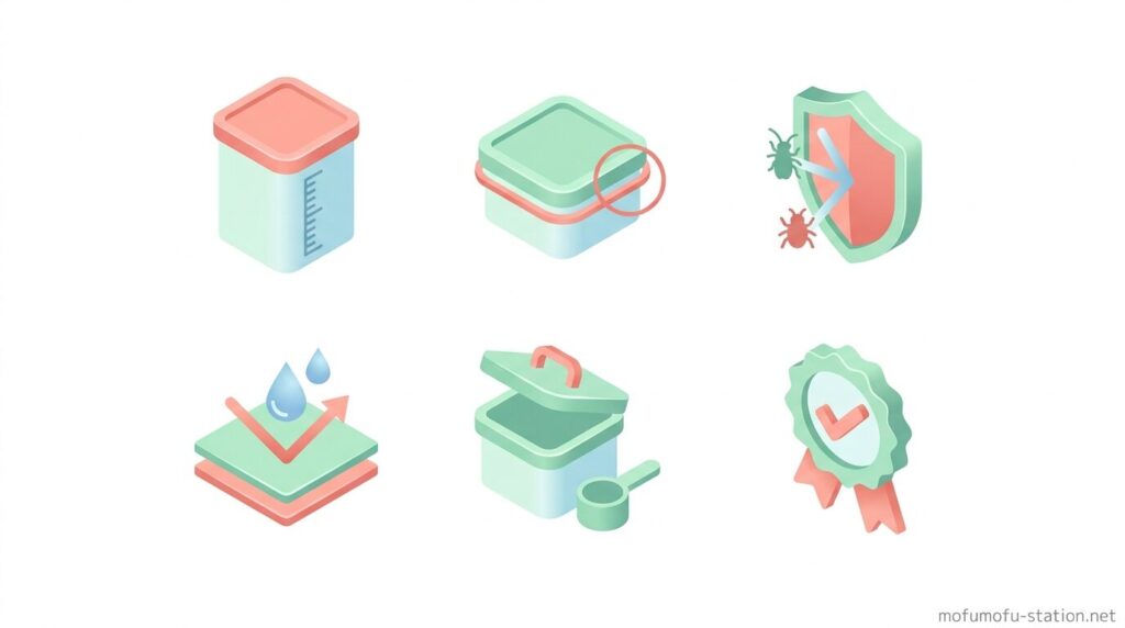 逆に失敗しやすいのは、密閉が弱く湿気が入るケース、サイズが合わず使いにくいケース、におい漏れで虫が寄るケースです。これらは事前に構造と容量を確認しておくことで防げます。