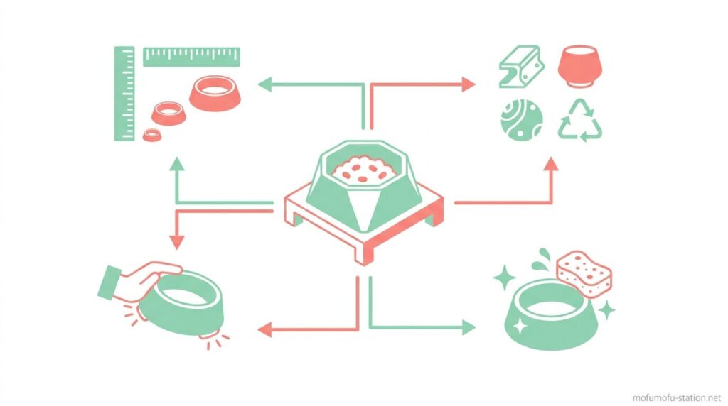 高さは胸の下〜前足の付け根に合う位置に合わせ、食事中に背中が水平に近い状態になるかで判断します。安定性は、押しても1cm以内しか動かないかを基準にし、500g以上の重さや滑り止めの有無を確認することでズレを防げます。
