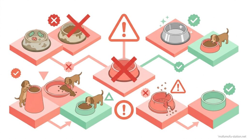 フードボウルはなんとなく選んでしまうと、使い始めてから「食べにくそう」「すぐ動く」「手入れが面倒」といった不満が出やすいアイテムです。特に毎日使うものだからこそ、小さな使いにくさが積み重なりやすいため、よくある失敗パターンを事前に押さえておくことが大切です。