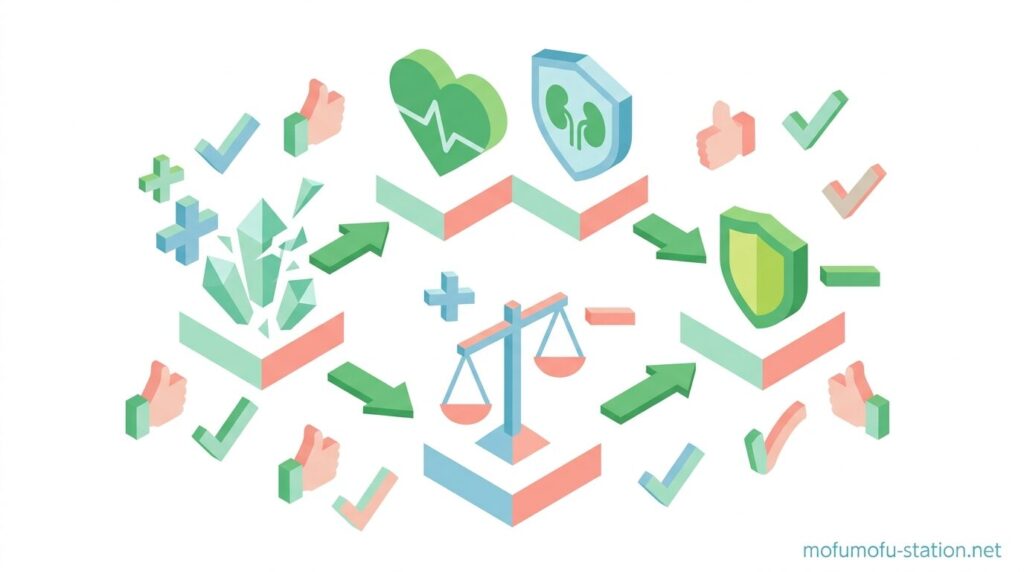 尿のpHを約6.0〜6.5に調整しつつ、ミネラルバランス(マグネシウムやリン)を抑え、尿量を増やすことで結晶が体内にとどまりにくい状態を作ります。