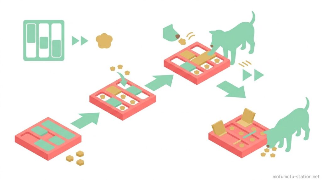 犬が触ってからすぐ取り出せる難易度を目安にし、簡単すぎてすぐ全部出てしまう場合は量や出やすさを調整し、逆に出てこない状態が続く場合は一段階戻します。