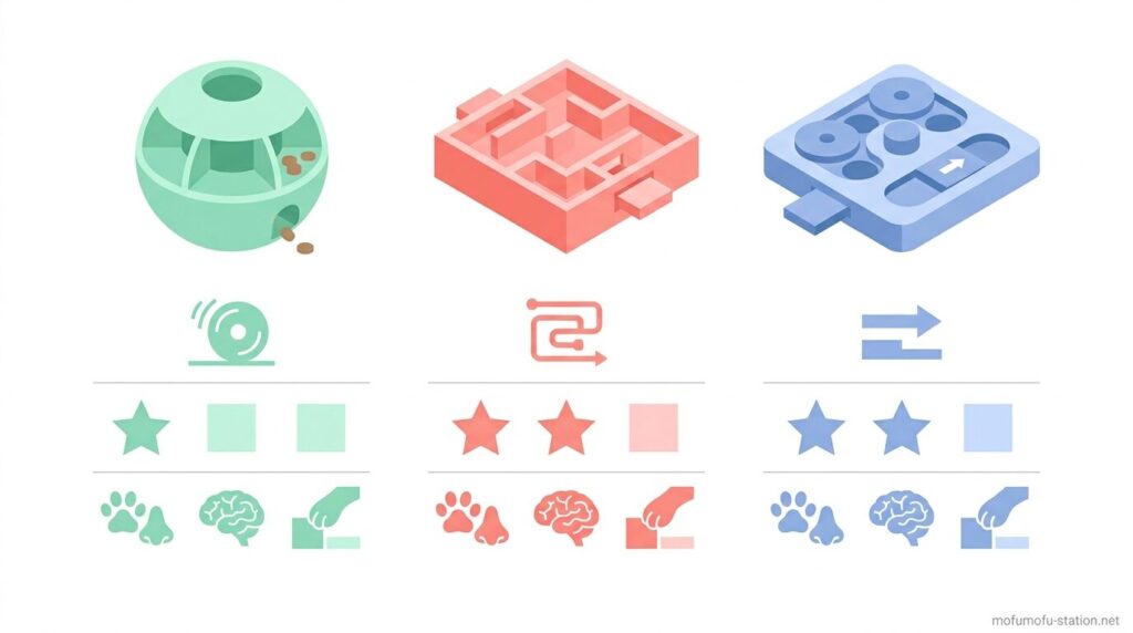 留守番中に長く集中させたいのか、食事のスピードを落としたいのか、それともしっかり頭を使わせて疲れさせたいのかによって、選ぶべきタイプは変わるため、目的ごとに適した使い方を押さえておくことが重要です。