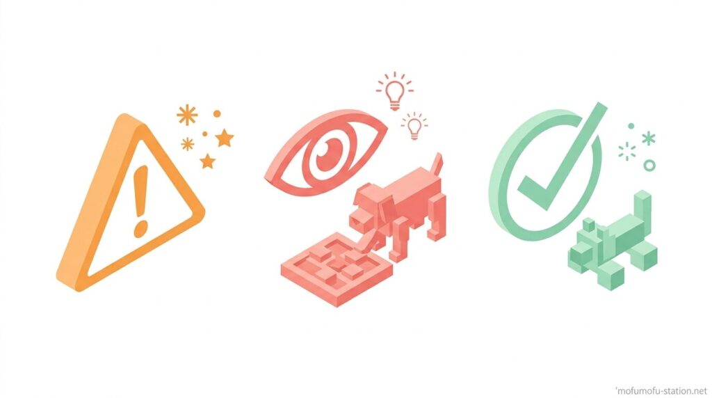 さらに、誤飲を防ぐためのサイズ選びや破損チェック、10分〜15分で必ず回収する管理、おやつ量を1日基準で調整することも欠かせません。