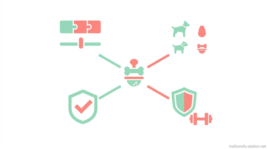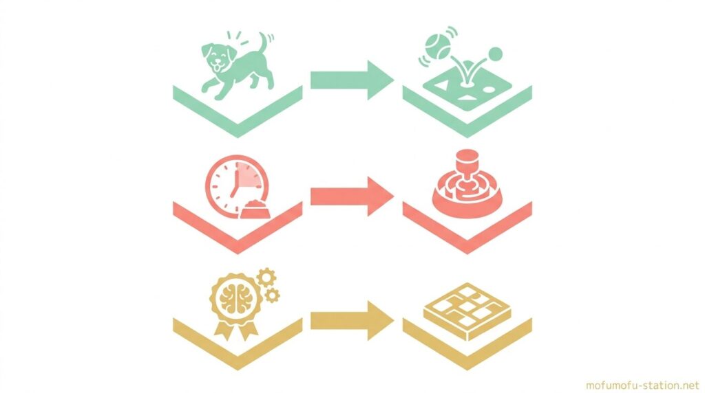 まず、おもちゃはサイズ・素材・難易度の3つを基準に選ぶことが重要で、口に対して1.5倍以上のサイズ、厚み8〜12mm以上の耐久性、そして1回10〜20分で取り出せる難易度に調整することで、誤飲や破損を防ぎながら継続して使える状態になります。