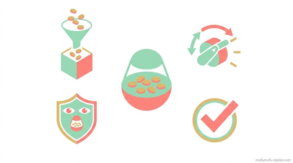 さらに、使い方では最初に30秒以内に1粒出る設定から始めて成功体験を作り、おやつの量を1日の食事量の10%以内に抑えつつ、粒サイズや種類を調整することで、食べすぎを防ぎながら遊び時間をコントロールできます。加えて、2〜3種類を48時間以上間隔を空けてローテーションすることで、飽きずに遊び続けやすくなります。