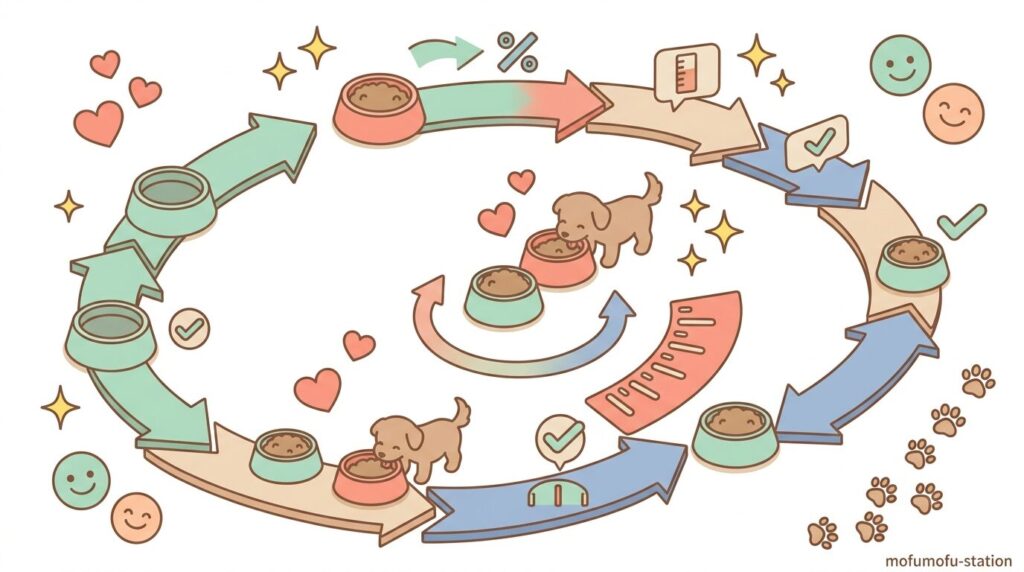 急に全量を変えると消化が追いつかず下痢や食欲低下が起こりやすくなるため、割合を段階的に変えることで胃腸への負担を抑えます。