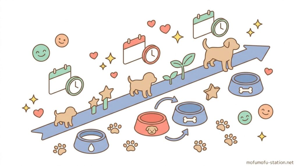 フードは1日で全量を切り替えず、最低でも7日間かけて割合を変えながら進め、その間は毎日便の状態と食欲を確認します。