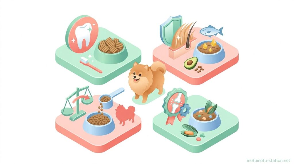 ポメラニアンに合うドッグフードは、「総合バランス」「涙やけ対策」「毛並みケア」「体重管理」「年齢別」「関節ケア」といった目的ごとに選ぶ基準が変わります。
