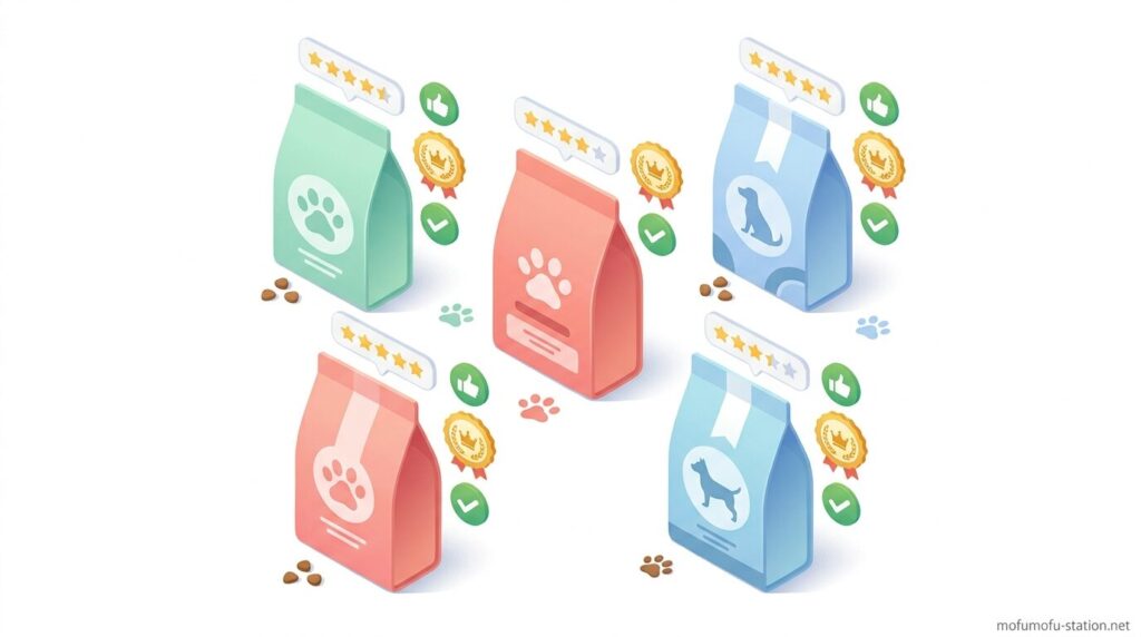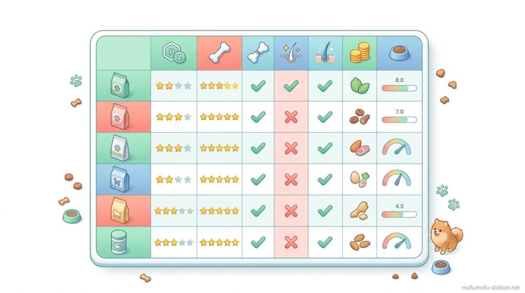 比較一覧では、この5つの条件を横並びで確認できる形にしておくと、見た目や知名度ではなく、体格と食べ方に合うフードを判断しやすくなります。