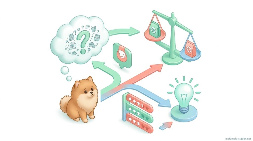 ポメラニアン用のフード選びで迷った場合は、まず細かい比較よりも「最低限ここを満たしているか」を基準に絞ることが重要です。特に原材料の質と栄養数値は、毛並み・体重・消化状態すべてに直結するため、この2点だけは最初に確認して外さないようにします。