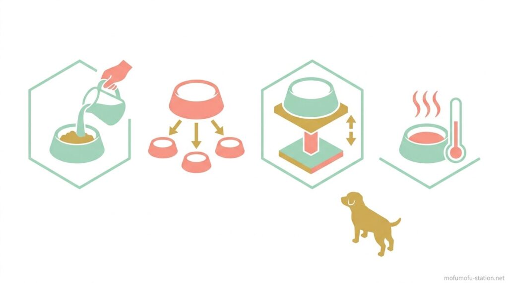 老犬のご飯は、硬さ・量・温度・環境を調整することで食べやすさが大きく変わります。ドライフードはぬるま湯でふやかして柔らかくし、1日量を2〜4回に分けて少量ずつ与え、35〜38℃程度に温めて匂いを引き出すことで、噛む力や嗅覚が落ちていても食べやすくなります。