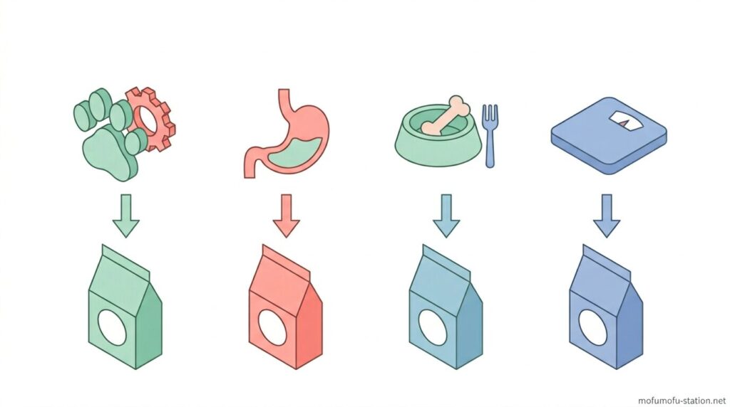 食いつきが落ちているのか、消化に不安があるのか、関節への負担を減らしたいのか、あるいは体重管理や継続しやすさを重視したいのかによって、適したフードの基準はまったく異なります。