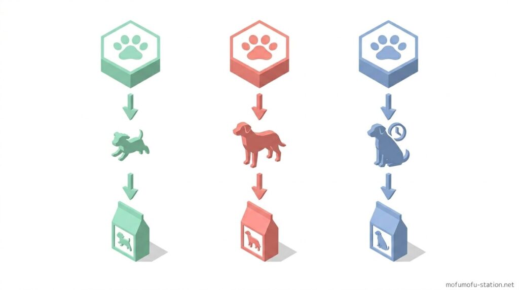 ここでは「原材料」「向いている犬」「食いつき」の3つに分けて、具体的にどこが違うのかを順番に整理していきます。